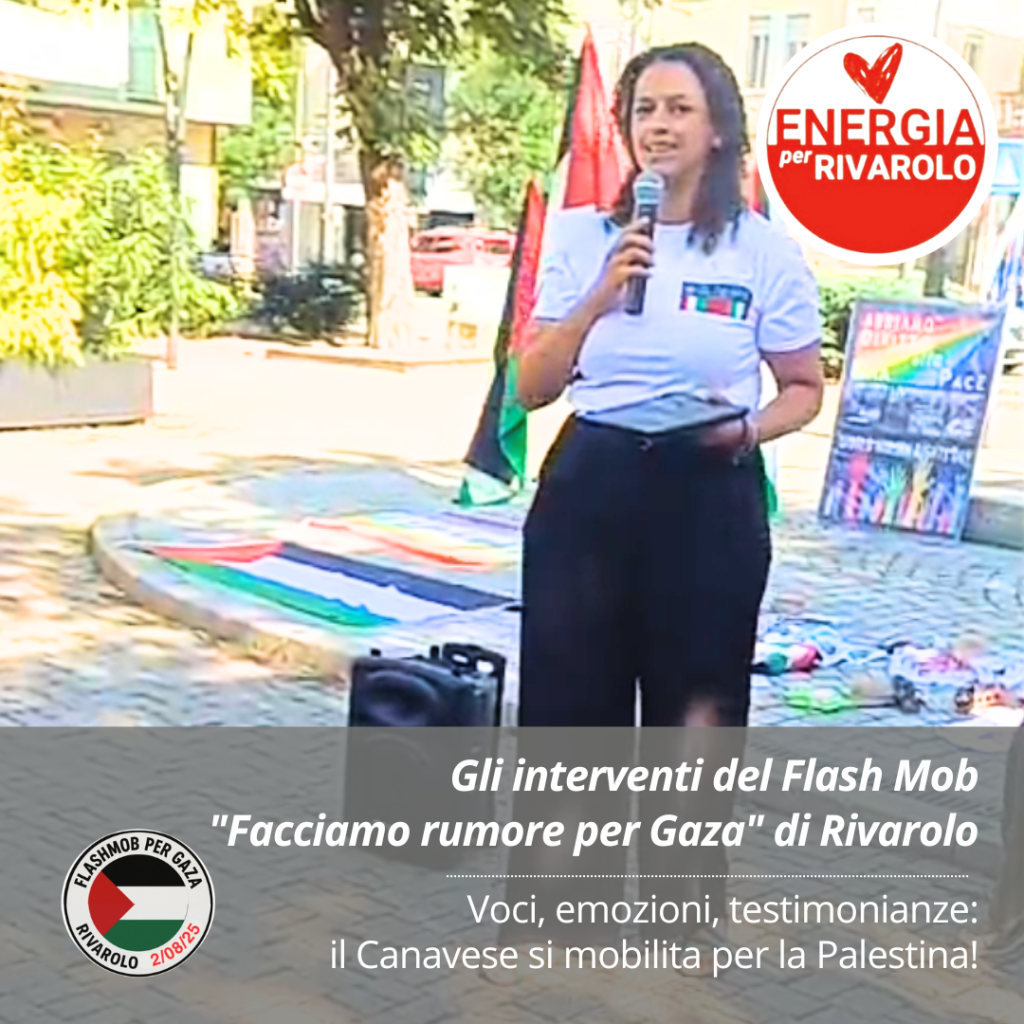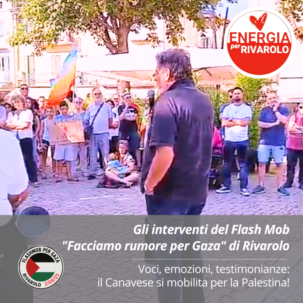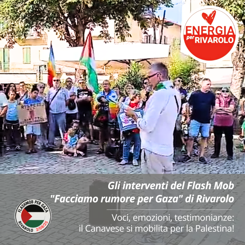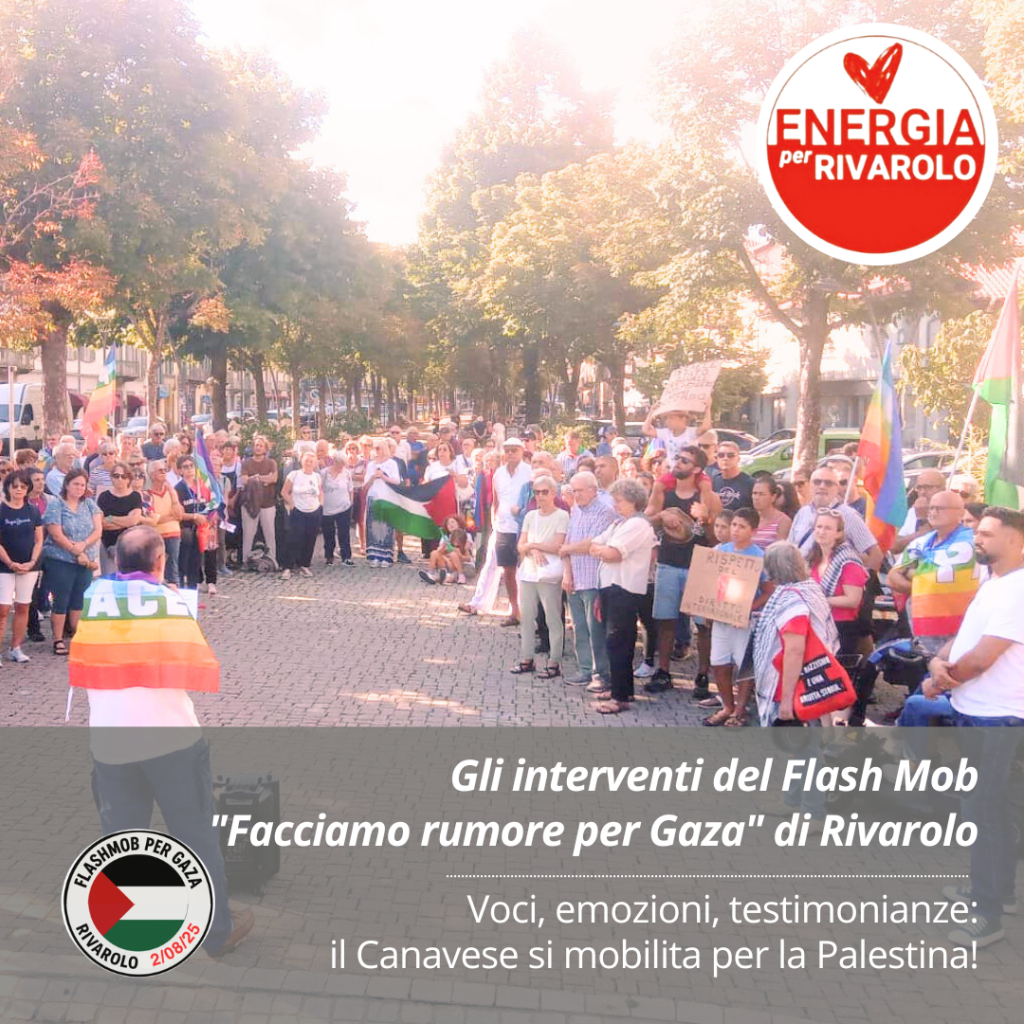 Il 2 agosto 2025, Rivarolo Canavese ha scelto di non restare in silenzio. Con il flash mob “Facciamo rumore per Gaza” associazioni, forze politiche e semplici cittadini si sono ritrovati per manifestare la propria indignazione e ribadire con forza che la pace, la giustizia e i diritti umani non hanno confini.